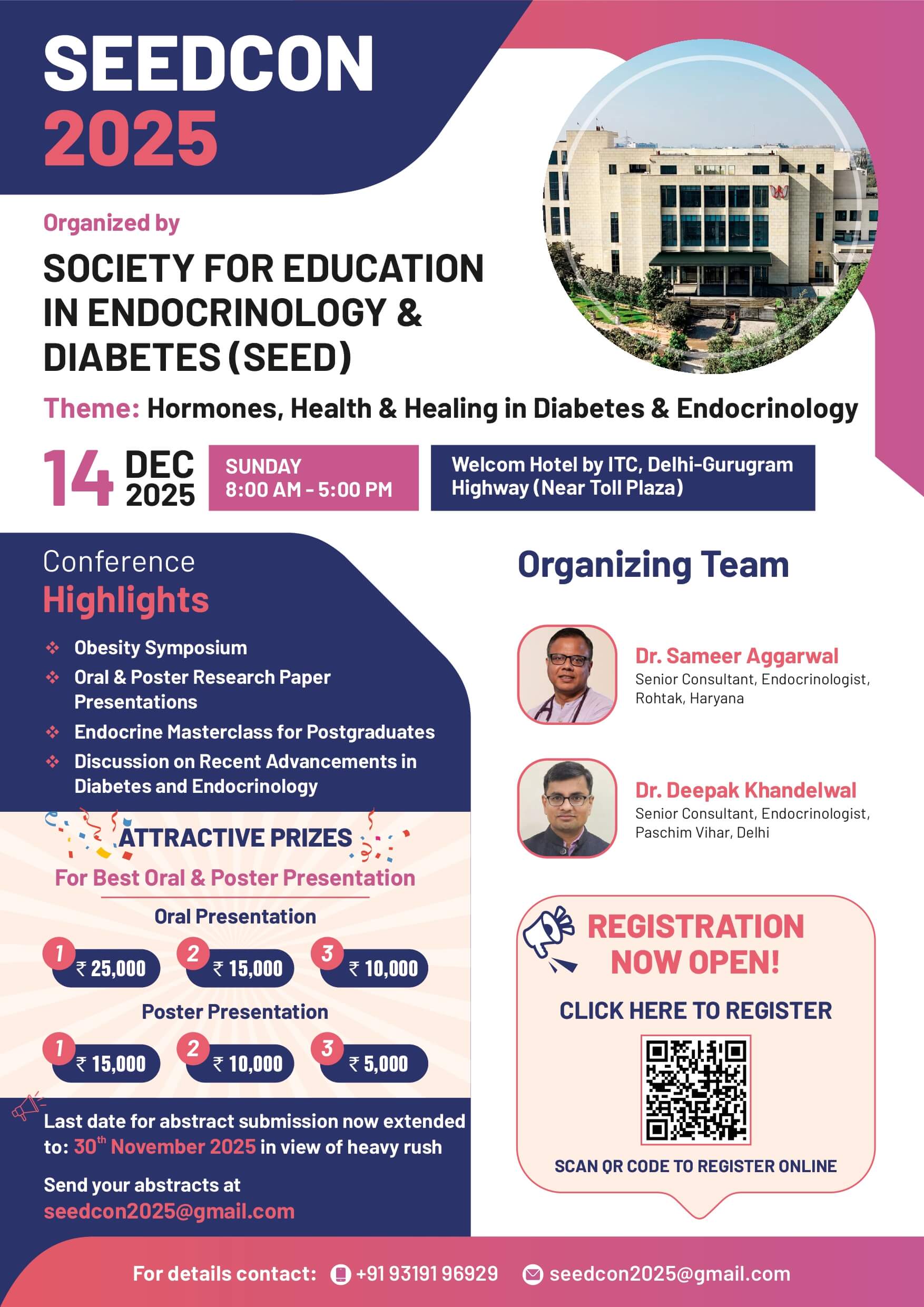 Society for Education in Endocrinology & Diabetes (SEED) was born out of an yearning to create an academic platform encompassing super-specialists, general physicians and community at large. The objective of the society is to promote evidence based and updated endocrinology practice through educational interactions among the different echelons of our society.